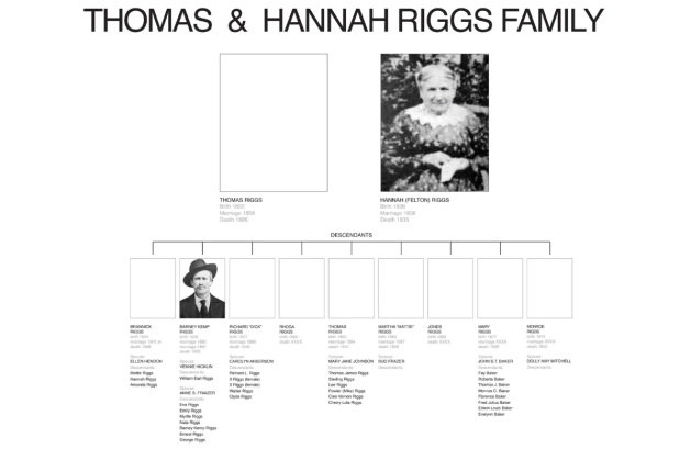 Thomas was the sixth child,fifth son of Thomas and Rhoda Riggs. He married Felton in Texas. Thomas and Hannah had nine children, xxx grandchildren, xxx great grandchildren and xxx great great grand child and xxx great great great grandchildren.